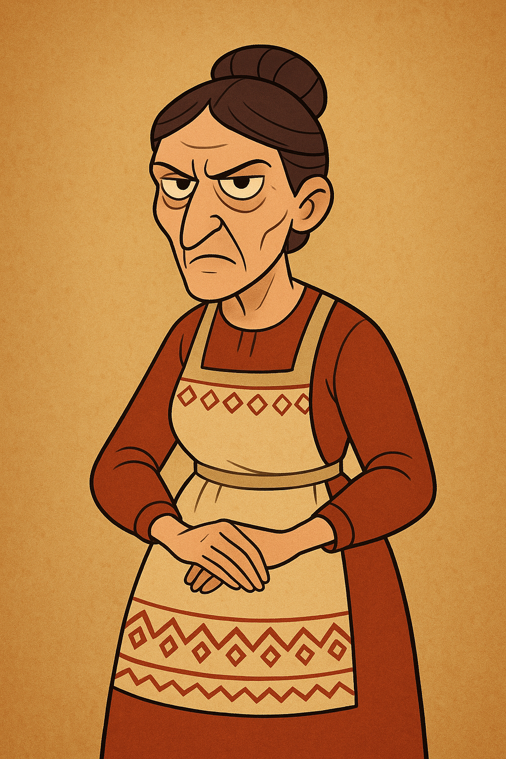 Строгая пожилая женщина с суровым выражением лица, волосы собраны в тугой пучок, в тёмно-красном платье и бежевом фартуке с красным орнаментом, руки скрещены, брови нахмурены. Карикатурно-злая, но всё ещё в милом войлочном стиле.