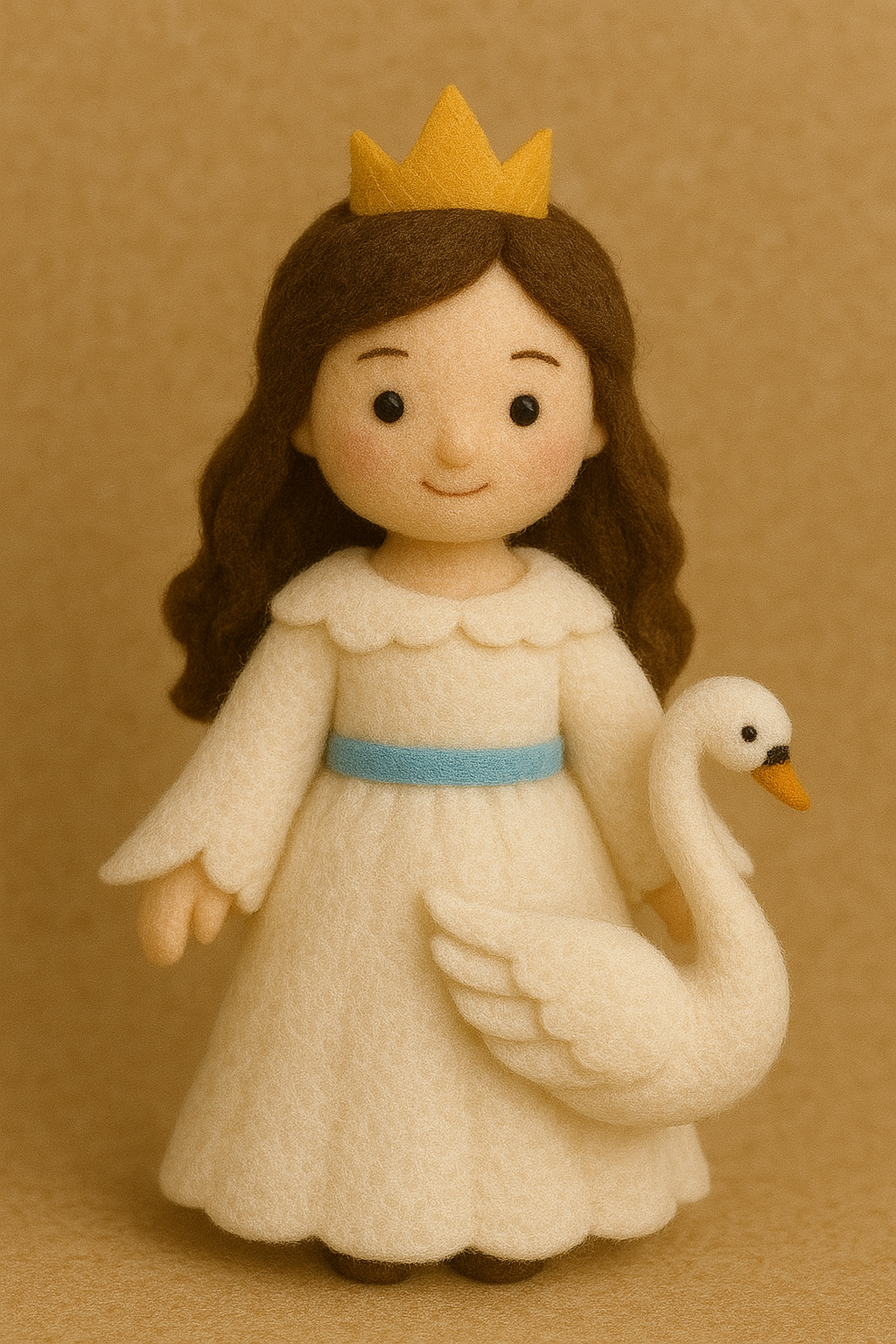 Нежная юная девушка-принцесса с длинными тёмно-каштановыми волосами, в белоснежном платье с широкими рукавами и голубым поясом, на голове маленькая золотая корона. В руках держит белого лебедя. Всё из шерсти, очень мягкий, «милый» стиль, большие чёрные глаза, румянец, атмосферное бежевое фото