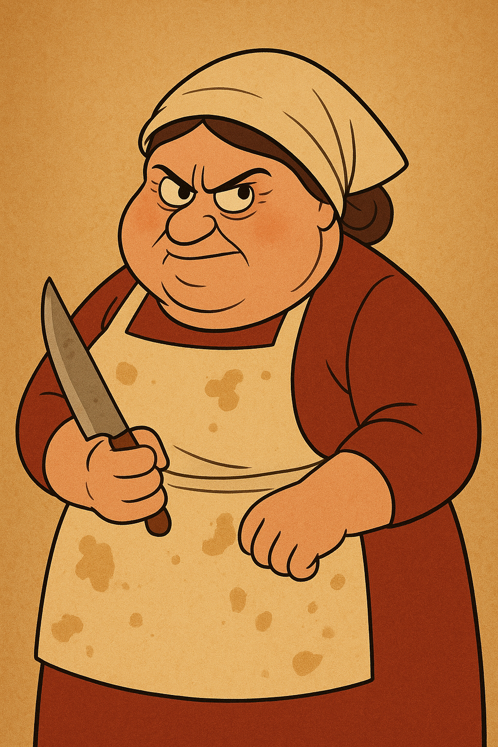 Толстая злая тётка в красновато-коричневом платье, белом грязноватом фартуке с пятнами и платке на голове, держит большой кухонный нож, ухмыляется недобро. Самая «страшная» из троицы.