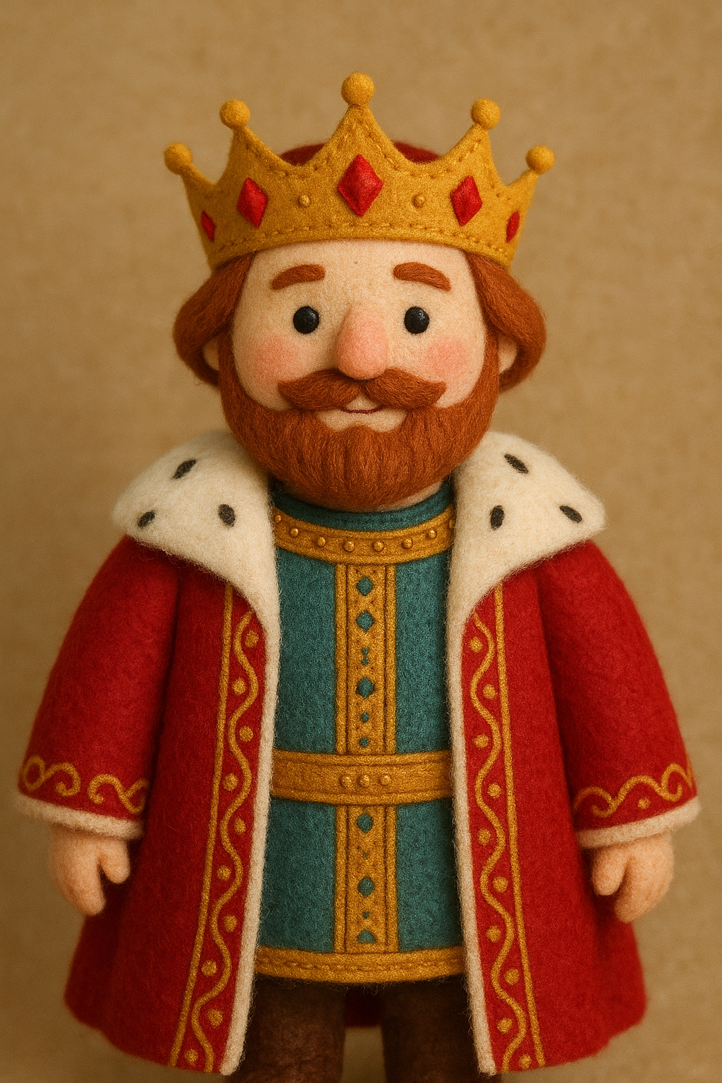 Милая войлочная кукла царя Салтана, рыжеватая борода и волосы, большая золотая корона с красными камнями, красное царское одеяние с белым мехом и золотой вышивкой, под низом бирюзовая рубаха, доброе спокойное лицо, большие чёрные глаза, детальная шерстяная текстура, тёплый бежевый фон, русская сказка, атмосферно и уютно